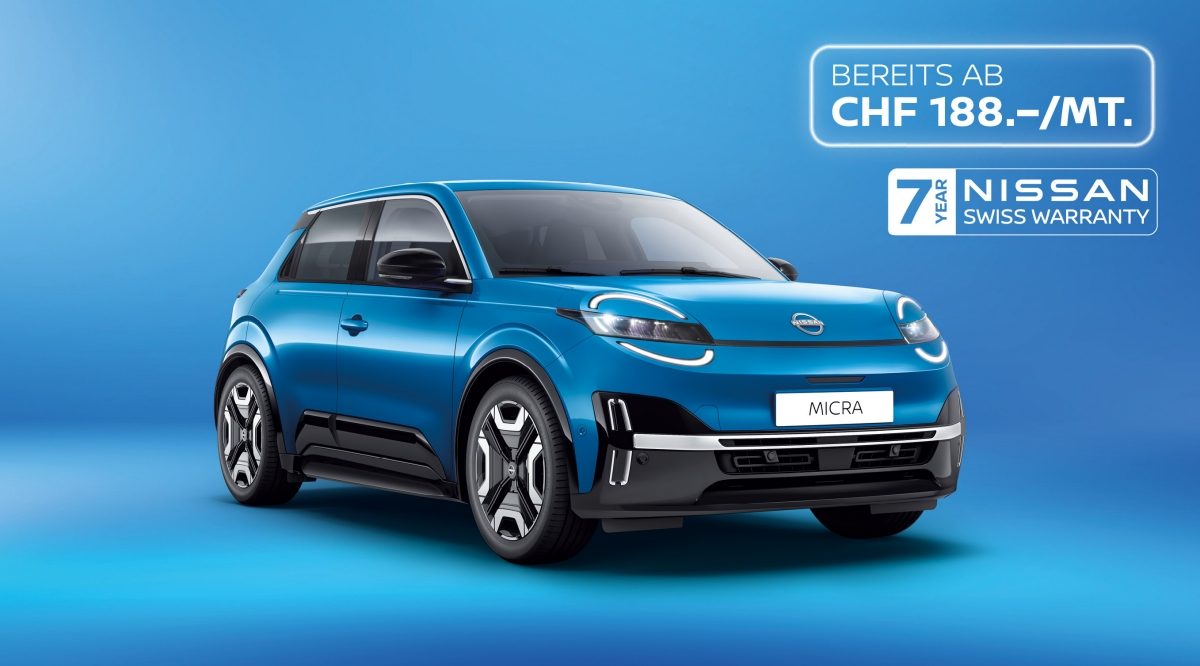 Leasingbeispiel: MICRA Engage, 120 PS, 42 kWh, Katalogpreis CHF 28’200.–, abzüglich Preisvorteil CHF 1'000.- =CHF 27’200.–. Energieverbrauch: 15.8 kWh/100 km, Benzinäquivalent: 1.7 l/100 km, CO₂-Emissionen: 0 g/km, CO₂-Emissionen aus der Strombereitstellung: 17 g/km, Energieeffizienz-Kategorie: B. Laufzeit 60 Monate, Laufleistung 10’000 km/Jahr, nominaler Jahreszins 2.90%, effektiver Jahreszins 2.94%, Anzahlung CHF 8’401.–, Restwert CHF 10’152.–; Leasingrate ab CHF 179.00.-/Mt, exkl. obligatorische Vollkaskoversicherung. Die Kreditvergabe ist verboten, falls sie zur Überschuldung des Konsumenten führt. Preise inkl. MwSt. Preisänderung vorbehalten. Nur bei teilnehmenden Nissan Partnern in der Schweiz. Die Aktion läuft vom 01.01.2026 - 28.02.2026 bei Finanzierung über über Mobilize Financial Service, eine Marke für RCI Finance SA. Ausgeschlossen: Alle direktimportierten Fahrzeuge.